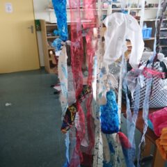 Die fleißigen Künstler*innen der Stüveschule gestalten mit bunten Requisiten und Torbögen das Wunderland der geheimen Gärten.